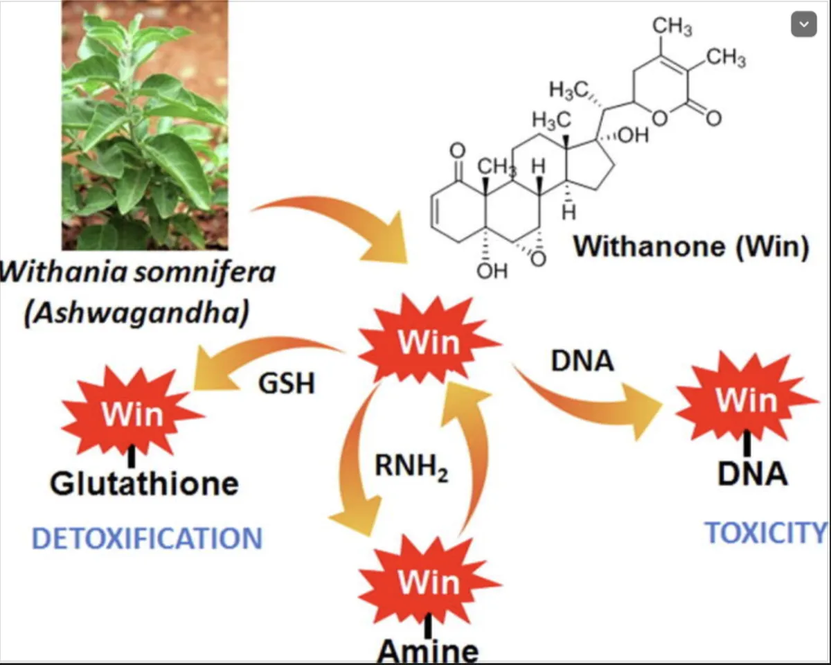 In mammalian cells, transfecting cells with withanone-treated DNA led to a decrease in gene expression and treating DNA with withanone and then trying to transform E. coli cells resulted in fewer colonies. The adduct formation can also overwhelm the protective system in cells if glutathione levels are low, as glutathione is crucial for detoxification. This situation could lead to apoptosis or a cytotoxic effect. This might be why we see some case reports of liver damage or failure ⁸ ⁹ ¹⁰. Having elevated glutathione levels may counteract this toxic effect, perhaps explaining why everyone doesn't get liver damage ⁷.