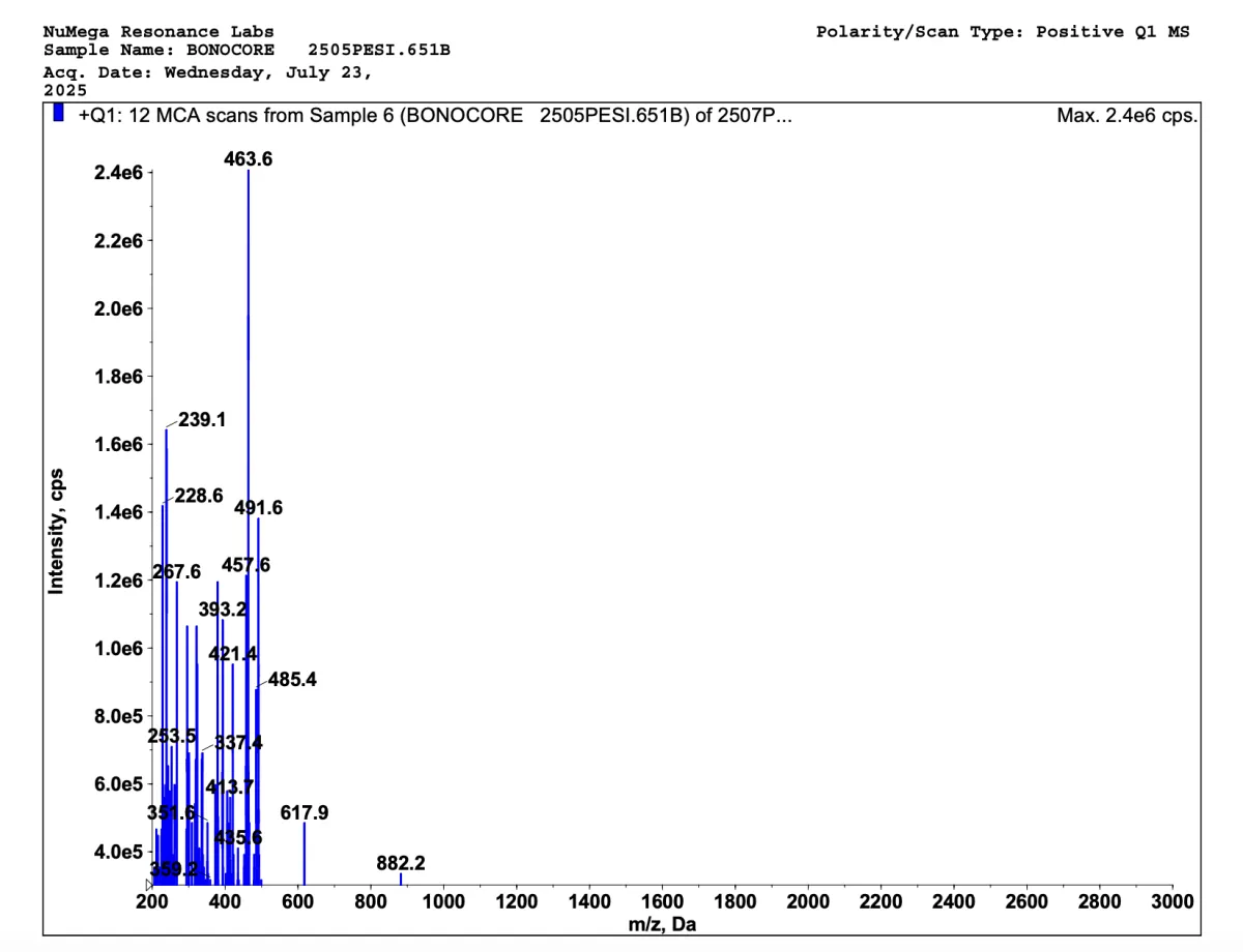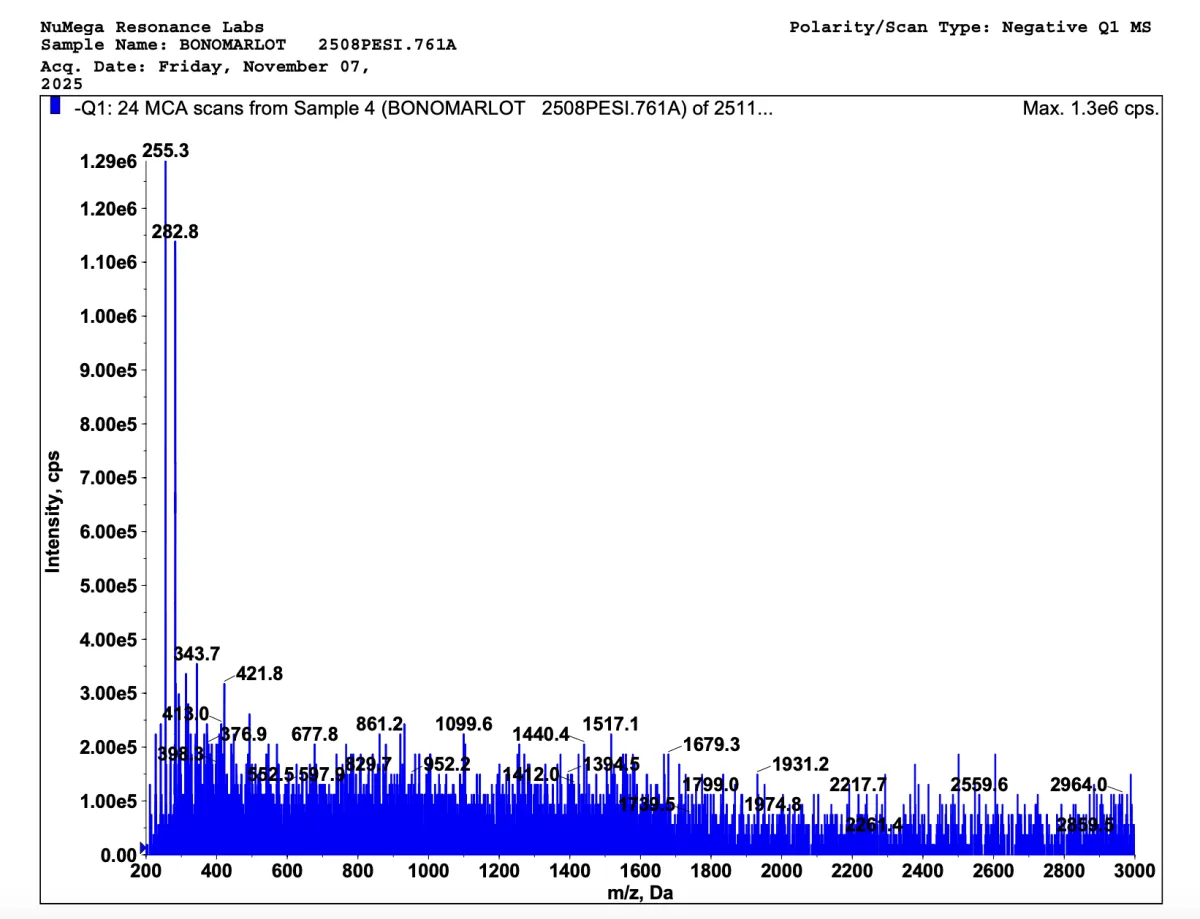 Below are mass spectrometries for Bonomarlot and Bonomarlot V2. A mass spectrometry is a special kind of scientific technique used to measure the mass-to-charge ratio of ions in a sample to identify, quantify, and determine the structure of molecules. This way we can see how truly impactful our bioregulators are; and our V2 bioregulators sure contains more peptides.