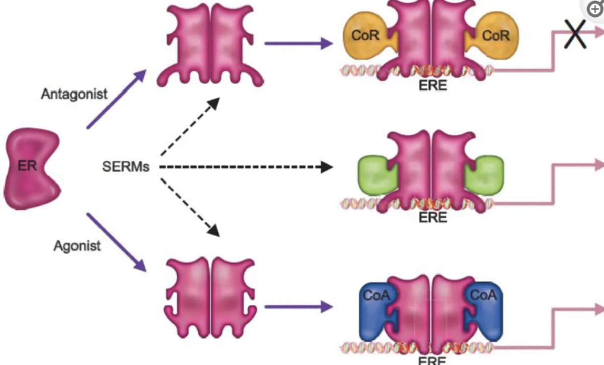SERM's selectively either antagonize(block) or agonize(activate) estrogen receptors depending on the tissue.