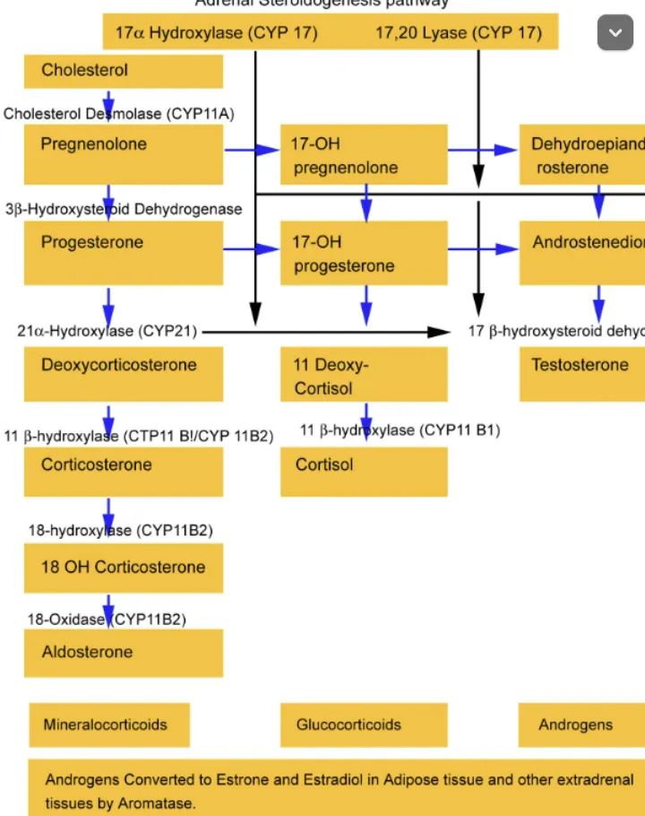 17a hydroxylase interruption also prevents the hydroxylation of progesterone and pregnenolone into the 17-hydroxy versions of these hormones, which are necessary cofactors for cortisol synthesis and DHEA/Androstenedione, which are important steroids for improving mood and depression ¹⁷, immune health ¹⁸, and fatigue ¹⁹.