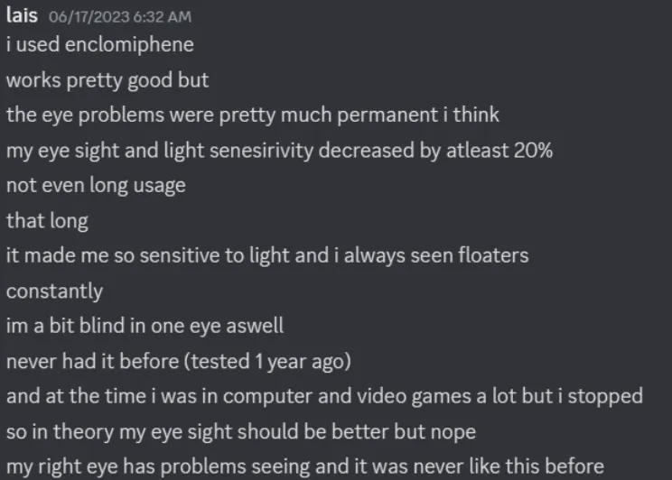 Clomiphene is known to damage the retina ²⁶ and anecdotes of vision sides and blindness exist with enclo.