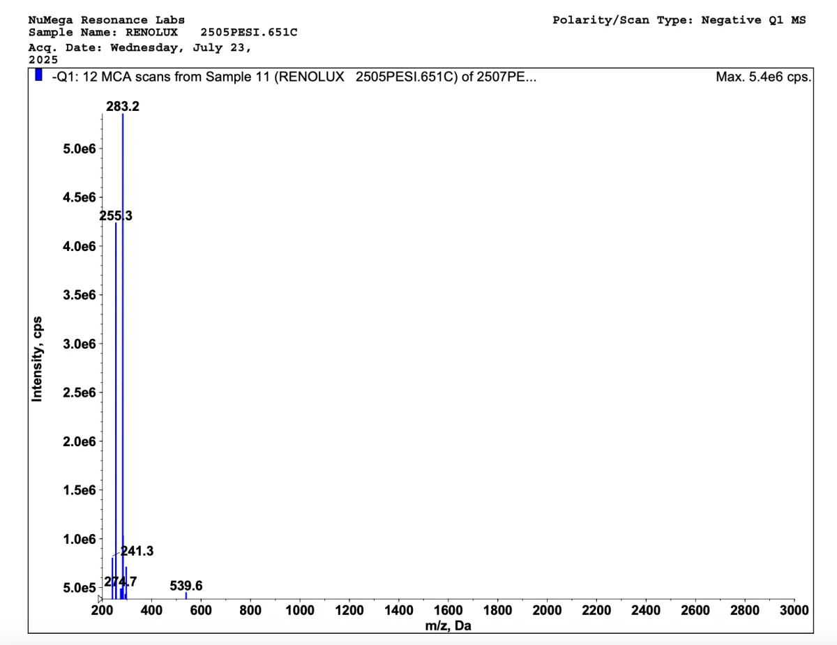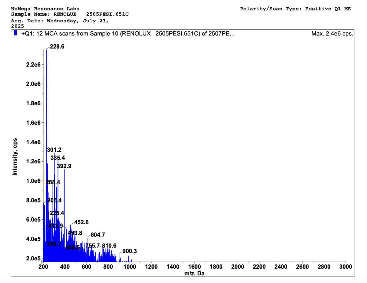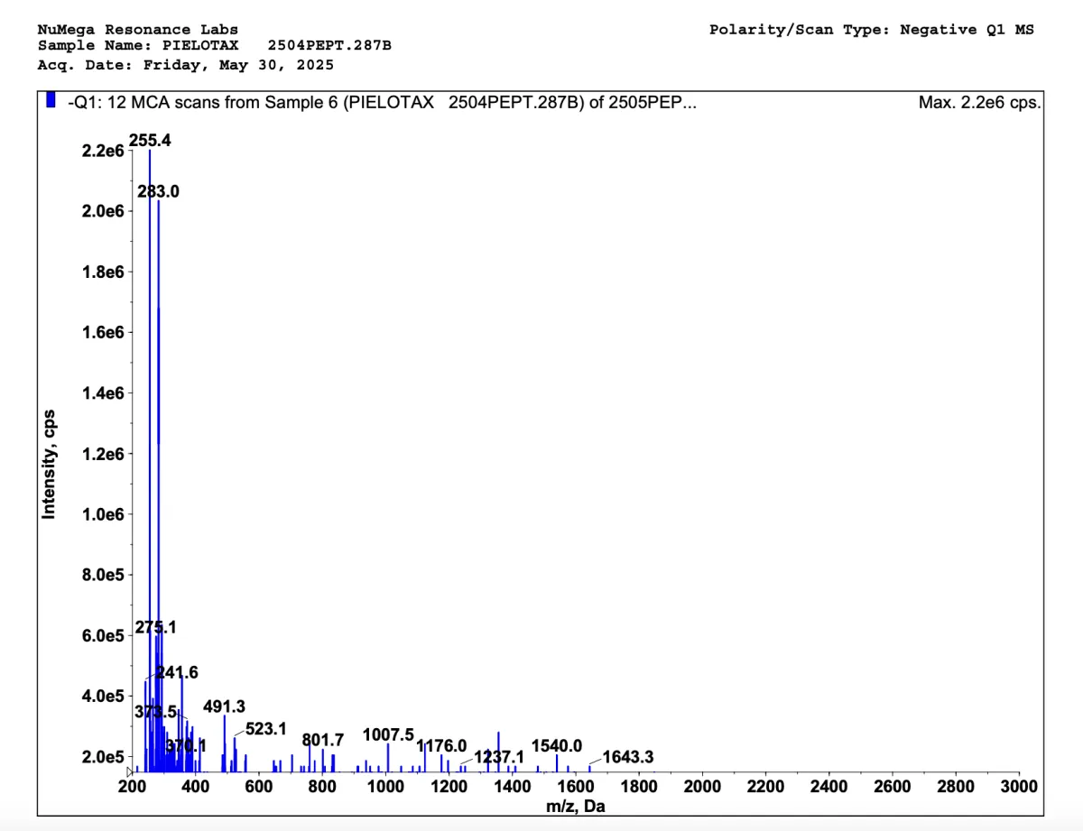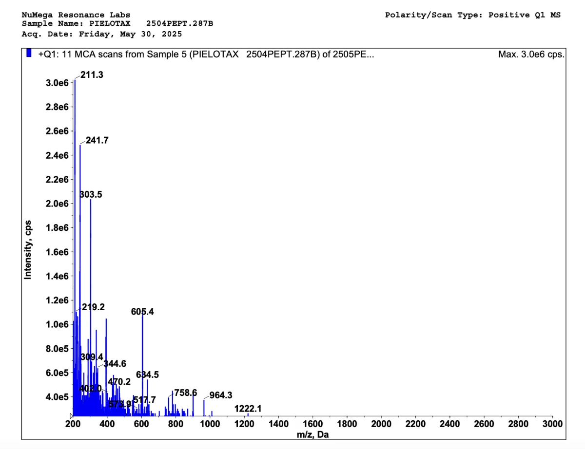 Below are mass spectrometries for Pielotax and Pielotax V2. A mass spectrometry is a special kind of scientific technique used to measure the mass-to-charge ratio of ions in a sample to identify, quantify, and determine the structure of molecules. This way we can see how truly impactful our bioregulators are; and our V2 bioregulators sure contains more peptides.