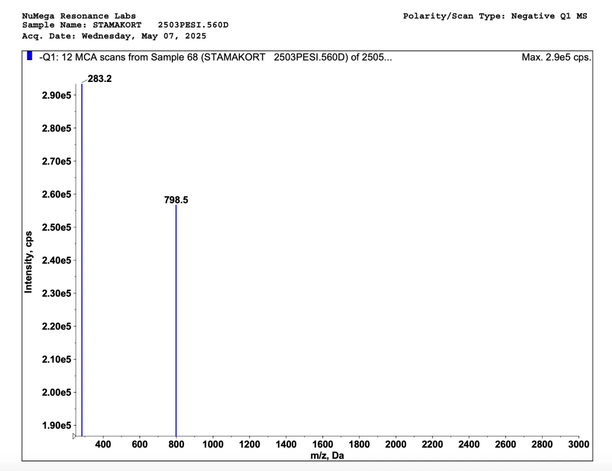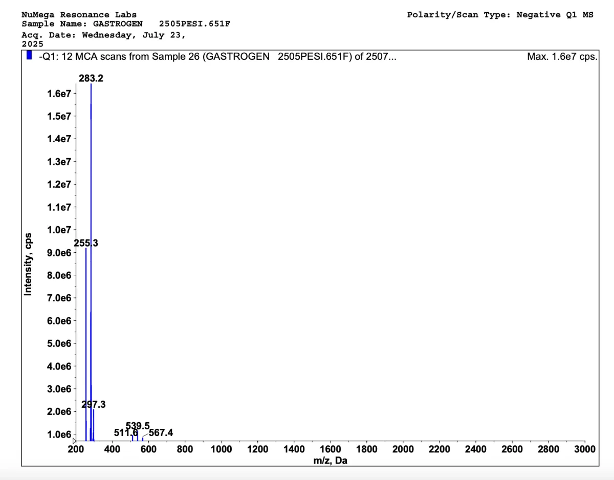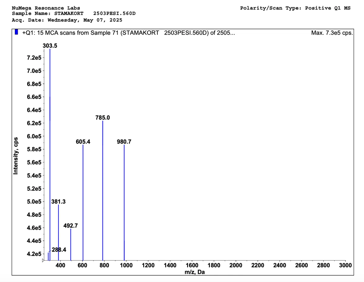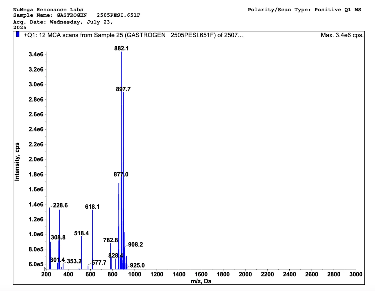 Below are mass spectrometries for Stamakort and Stamakort V2. A mass spectrometry is a special kind of scientific technique used to measure the mass-to-charge ratio of ions in a sample to identify, quantify, and determine the structure of molecules. This way we can see how truly impactful our bioregulators are; and our V2 bioregulators sure contains more peptides.