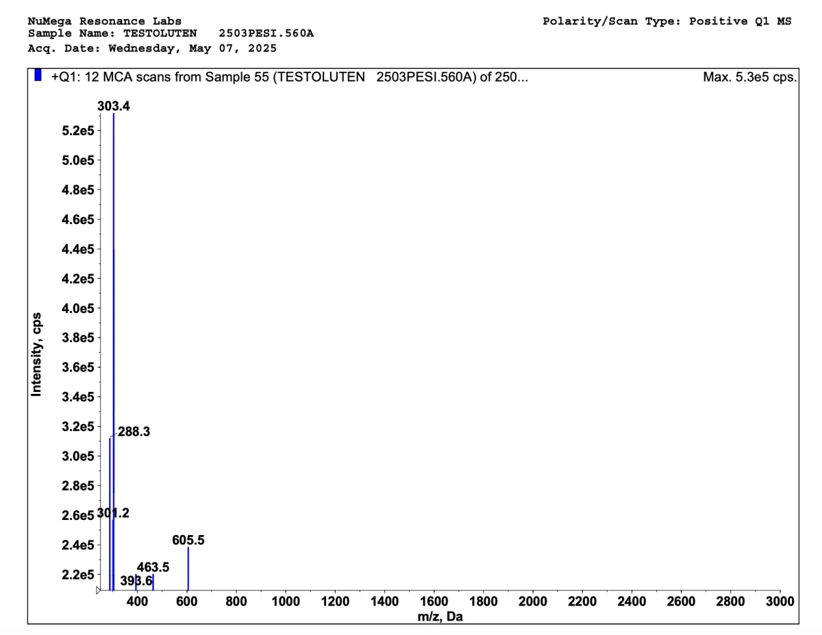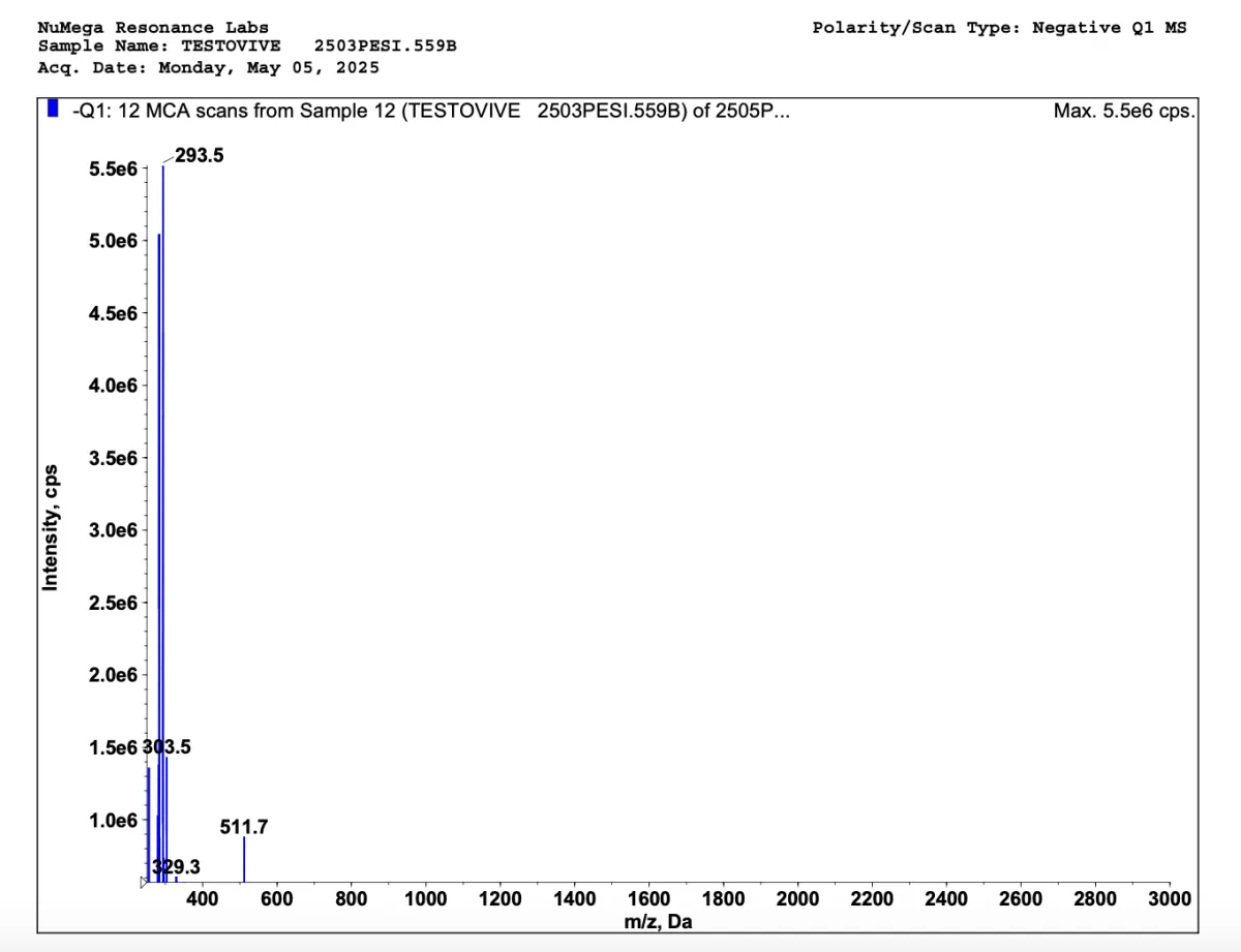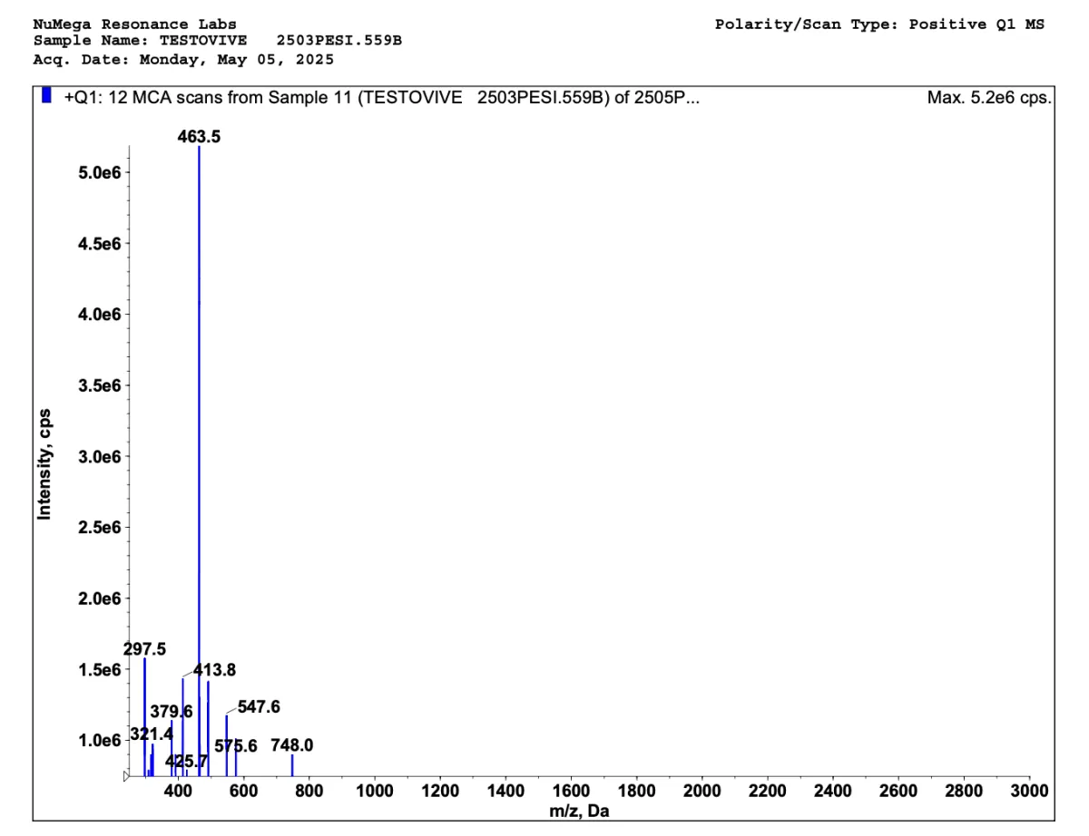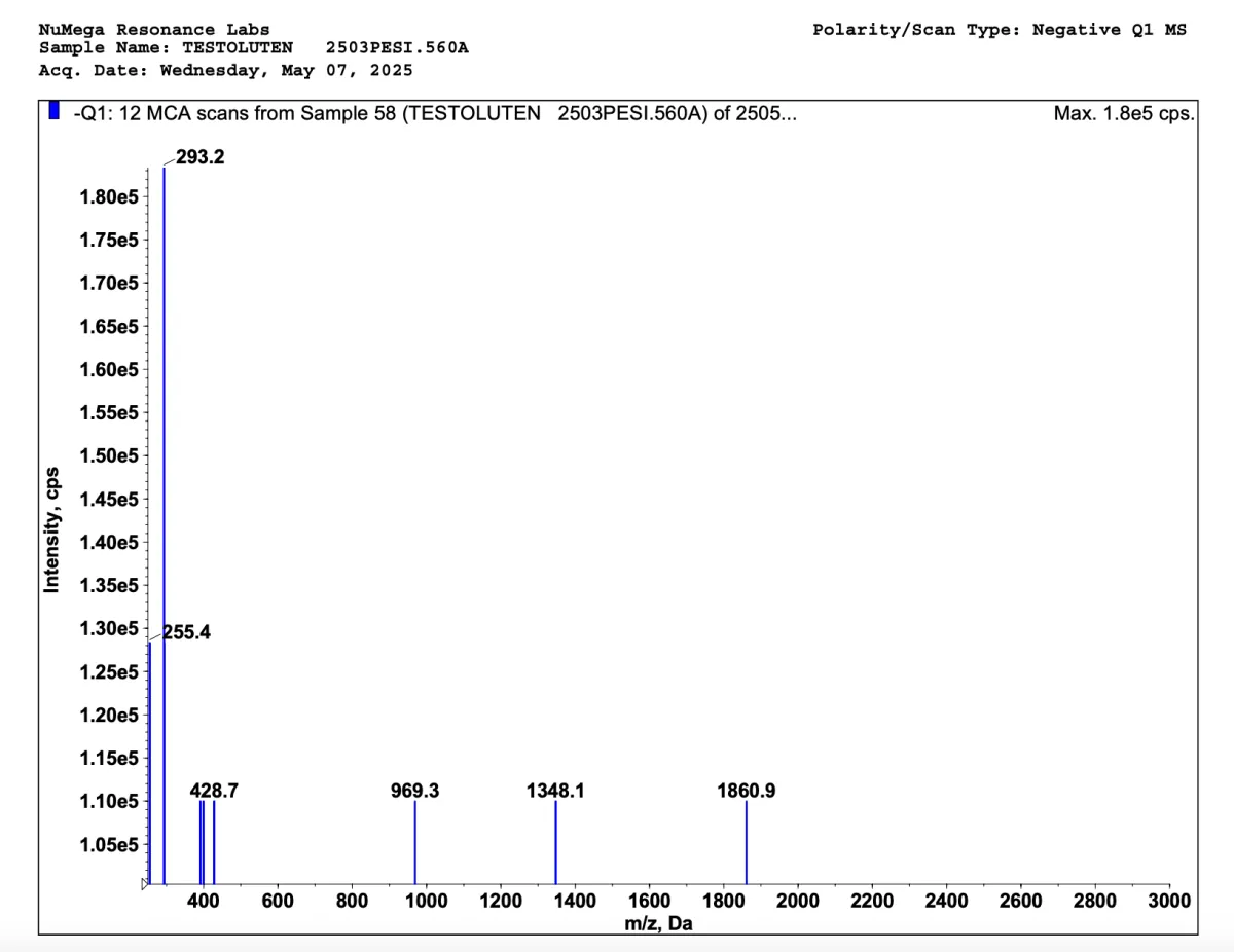 Below are mass spectrometries for Testoluten and Testoluten V2. A mass spectrometry is a special kind of scientific technique used to measure the mass-to-charge ratio of ions in a sample to identify, quantify, and determine the structure of molecules. This way we can see how truly impactful our bioregulators are; and our V2 bioregulators sure contains more peptides.