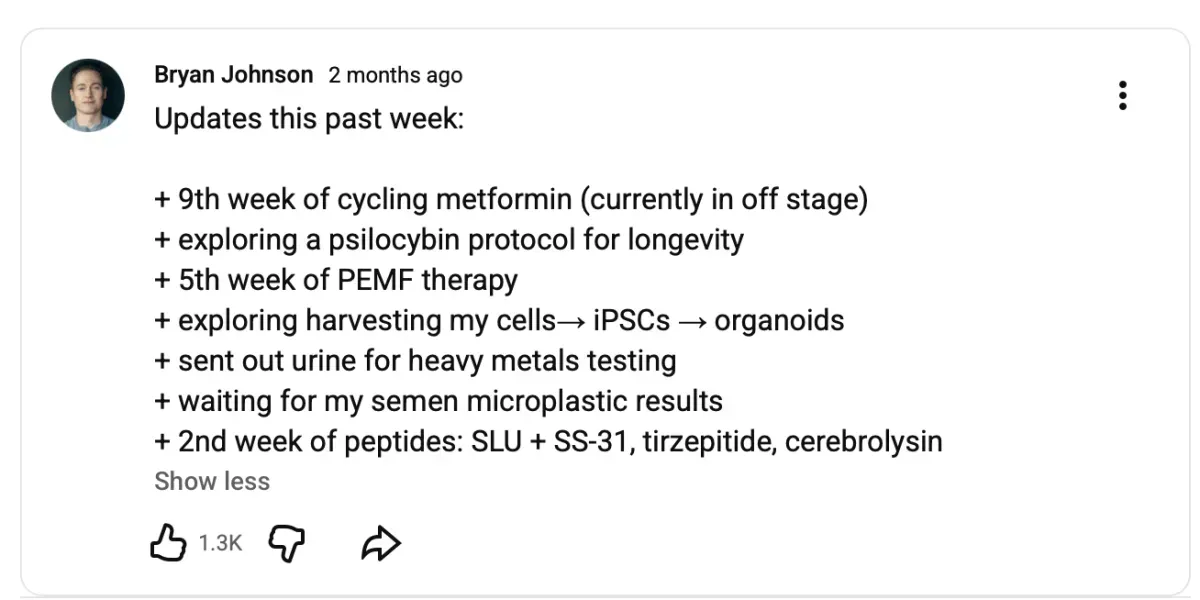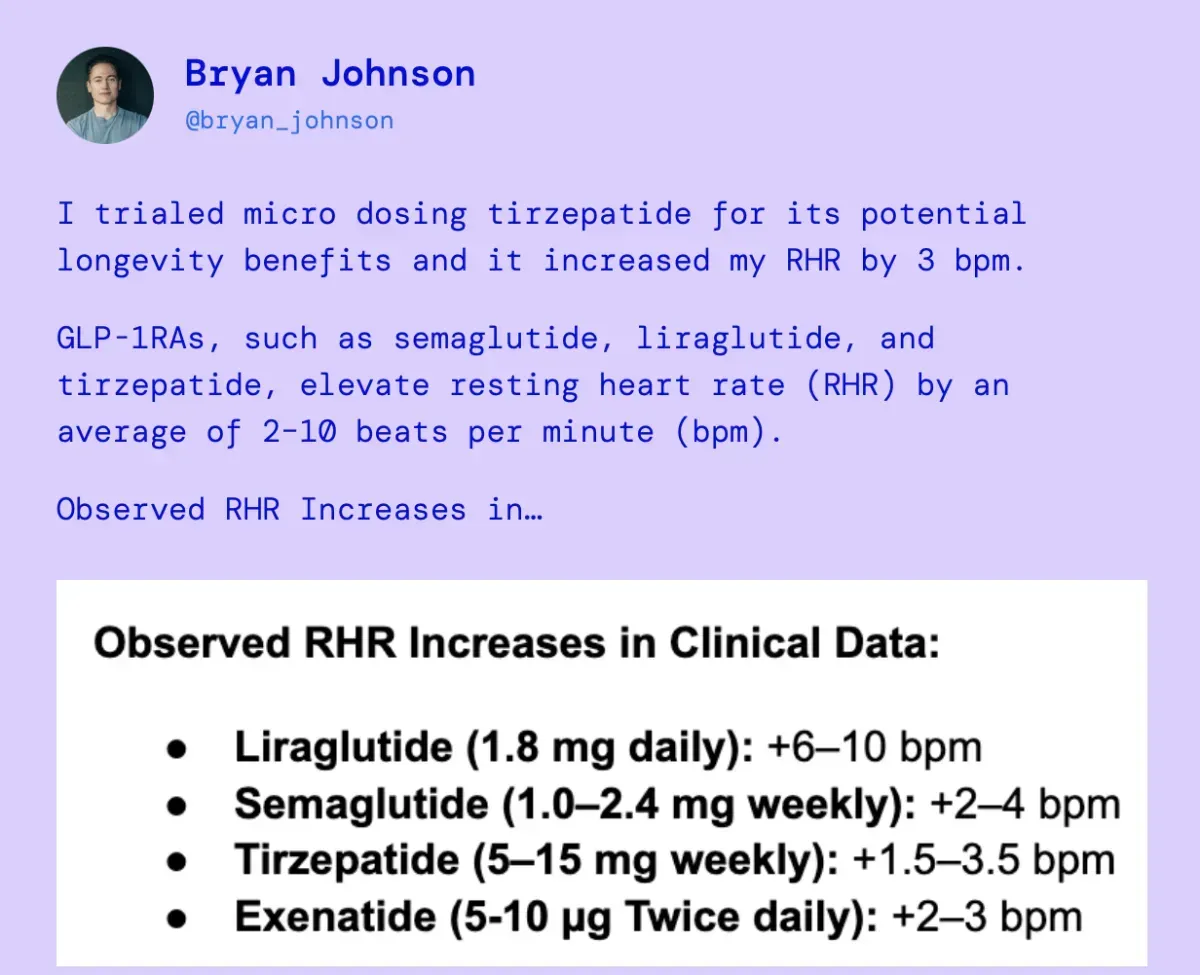 Bryan, was microdosing GLP1 agonists, in hopes of longevity. Theres no data to support it being a good idea for longevity.