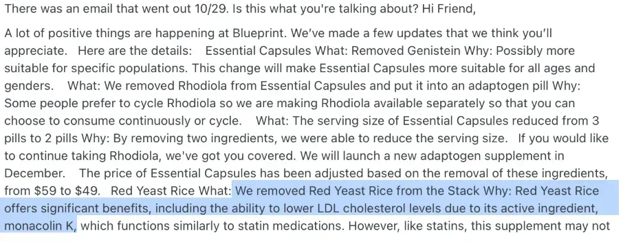 One such thing was that red yeast rice, included in an early Blueprint formulation, was a poor longevity choice due to: