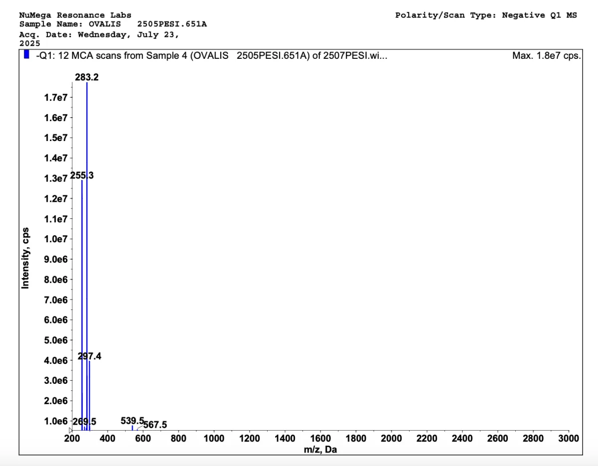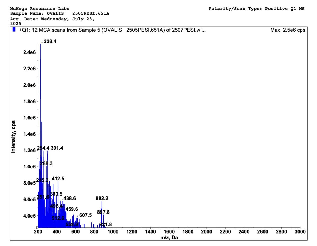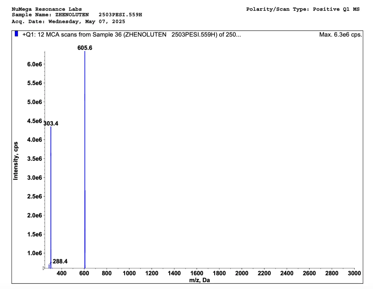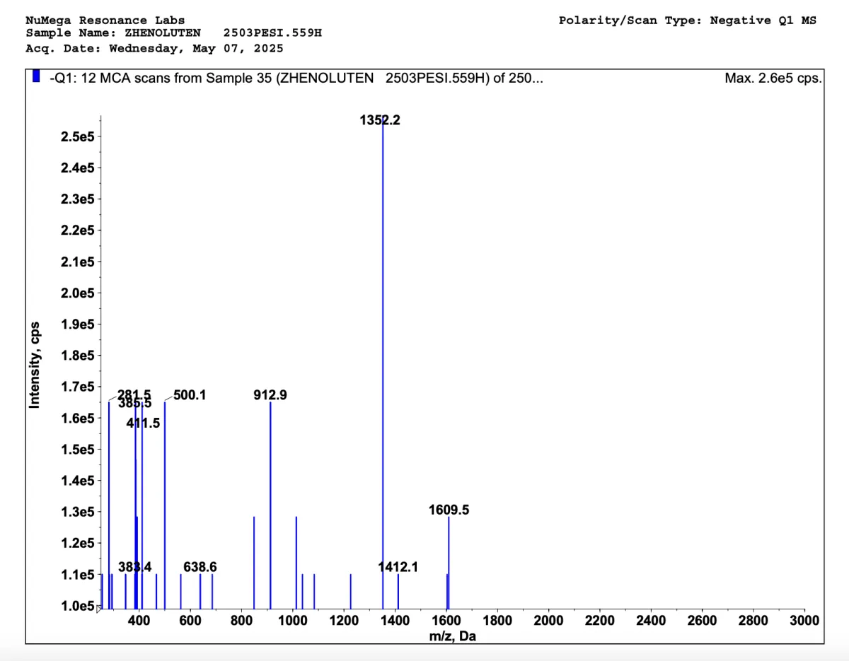 Below are mass spectrometries for Zhenoluten and Zhenoluten V2. A mass spectrometry is a special kind of scientific technique used to measure the mass-to-charge ratio of ions in a sample to identify, quantify, and determine the structure of molecules. This way we can see how truly impactful our bioregulators are; and our V2 bioregulators sure contains more peptides.